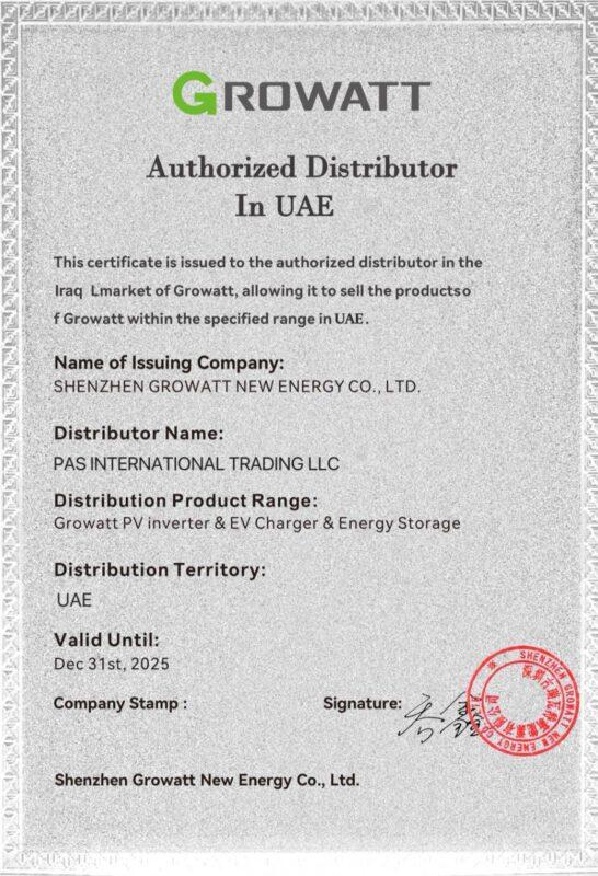 This certificate is issued to the authorized distributor in the Iraq market of Growatt, allowing it to sell the products of Growatt within the specified range in the UAE.
