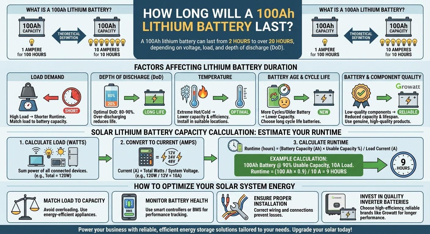 Factory owner, distributor of solar panels, or contractor involved in energy projects in Iran, Iraq, UAE, or Syria-most probably you have already heard something about the transformative power of solar lithium batteries. Power packs are changing how businesses can capture renewable energy in a more reliable, efficient, and cost-effective manner. But one question surely comes to your mind: How long will a 100Ah lithium battery last? A 100Ah lithium battery can last from 2 hours to over 20 hours, depending on voltage, load, and depth of discharge.