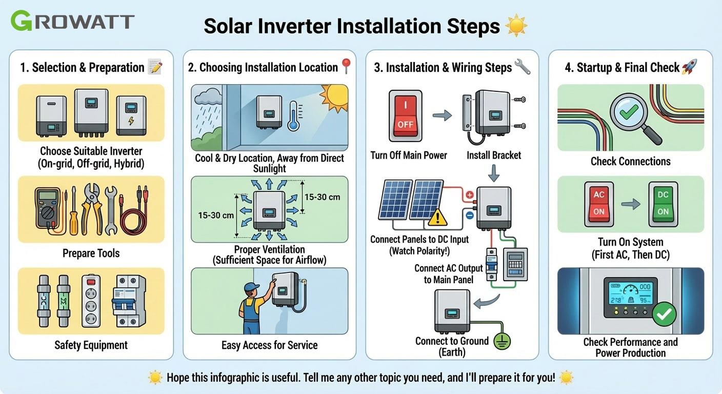 The inverter should be installed in a cool, dry, and well-ventilated area away from direct sunlight.